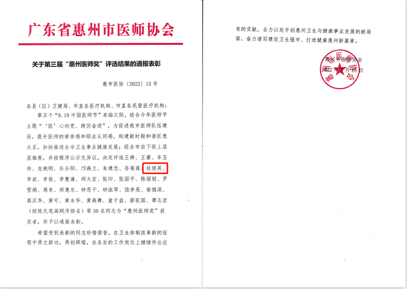 我院杜瓊英副主任醫(yī)師因在醫(yī)學(xué)領(lǐng)域成績(jī)突出贏得業(yè)界的高度肯定,獲得2022年惠州醫(yī)師獎(jiǎng)這項(xiàng)殊榮。